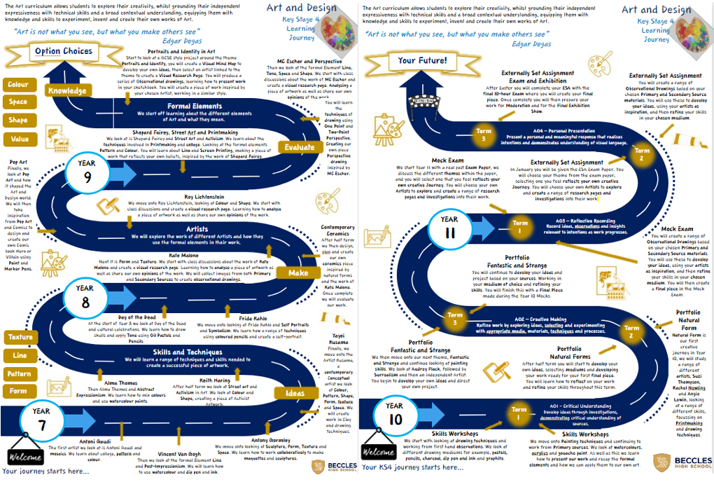 The Art curriculum allows students to explore their creativity, whilst grounding their independent expressiveness with technical skills and a broad contextual understanding, equipping them with knowledge and skills to experiment, invent and create their own works of Art.