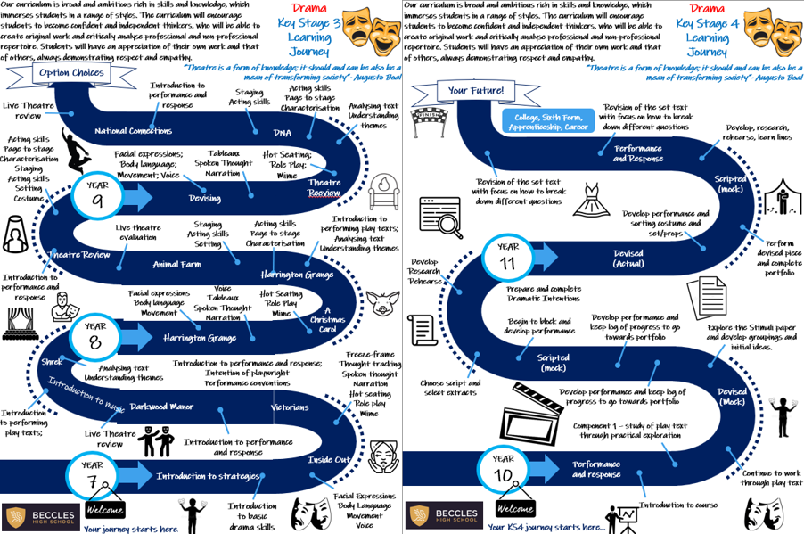 At the heart of our Performing Arts curriculum is the belief that every young person is inherently creative, and that Drama and Music provide powerful avenues for students to explore their identity, build confidence, and understand the world around them. Through a rich and ambitious curriculum from Year 7 to Year 11, we aim to develop students who are expressive, resilient, collaborative, and culturally aware—equipped with the skills and passions that will support them both in school and beyond.