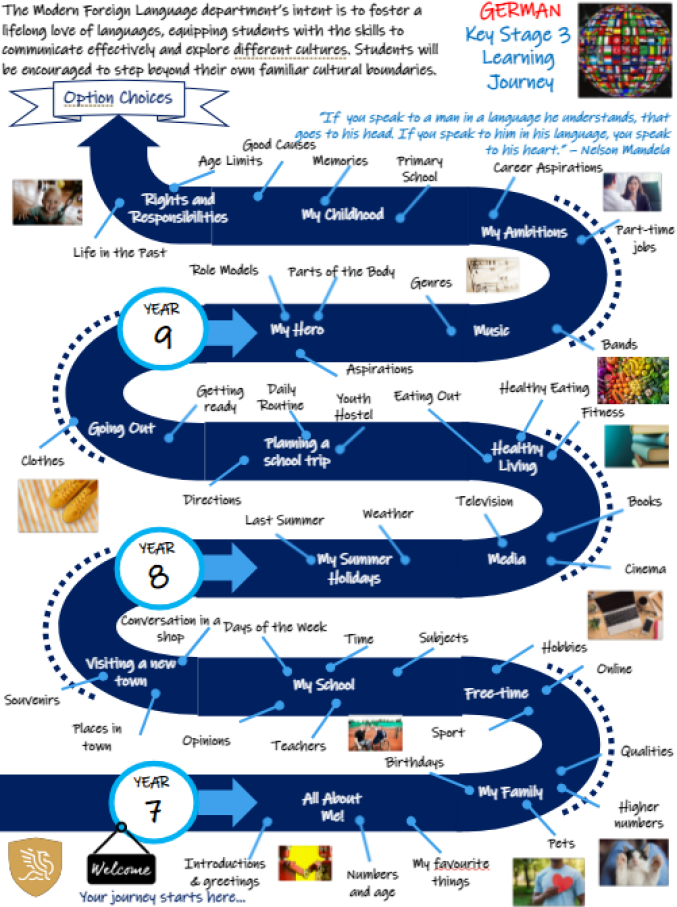 The Modern Foreign Language department’s intent is to foster a lifelong love of languages, equipping students with the skills to communicate effectively and explore different cultures. Students will be encouraged to step beyond their own familiar cultural boundaries.